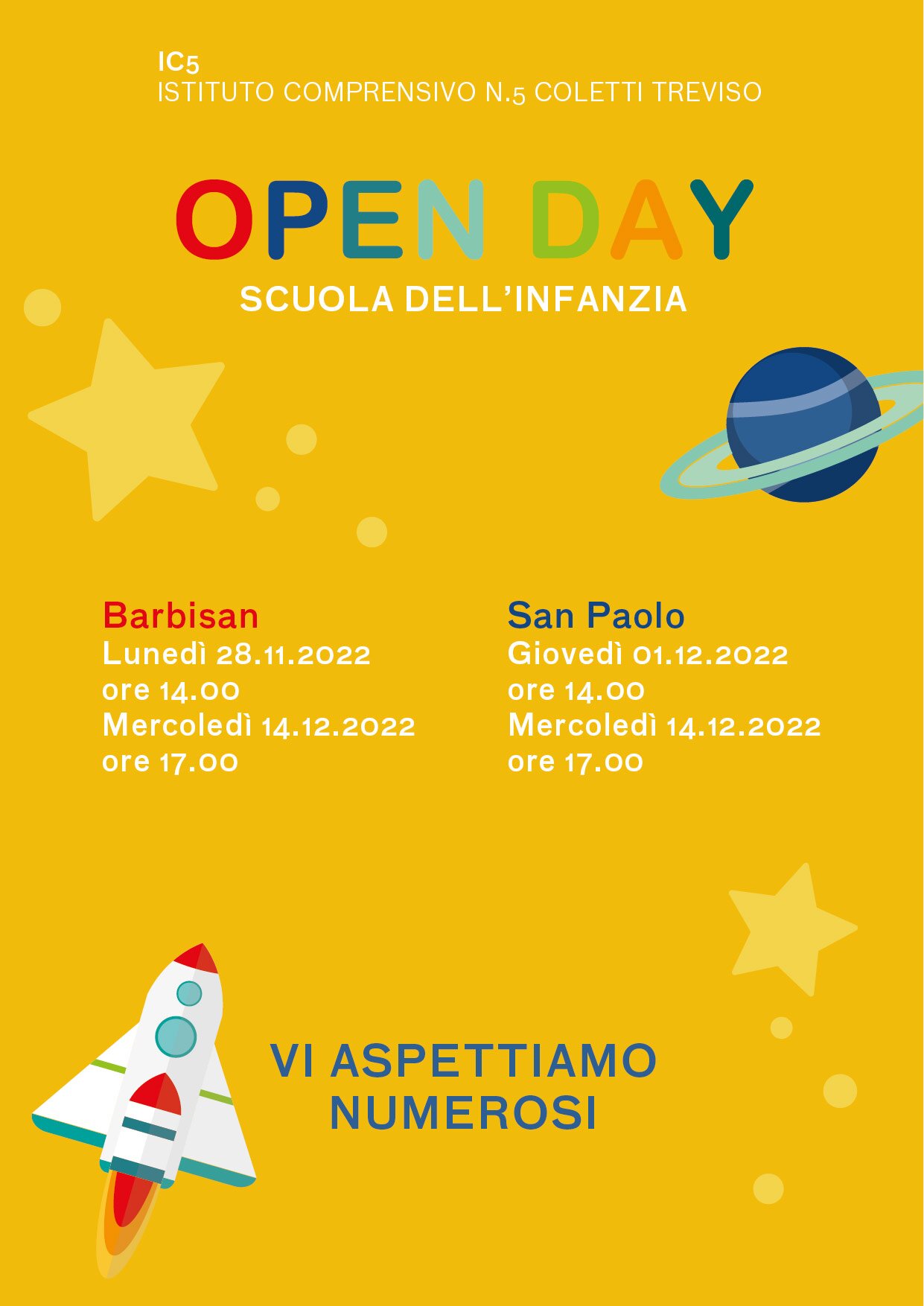 Si comunica che prossimamente si terranno i seguenti Open Day: Barbisan  Lunedì 28 novembre 2022 alle ore 14:00 Mercoledì 14 dicembre 2022 alle ore 17:00   San Paolo Giovedì 01 dicembre 2022 alle ore 14:00 Mercoledì 14 dicembre 2022 alle ore 17:00   Scarica la locandina: Open Day Scuola dell’Infanzia Scarica la brochure della Scuola dell’Infanzia Scarica la brochure dell’Istituto Comprensivo n. 5 Coletti